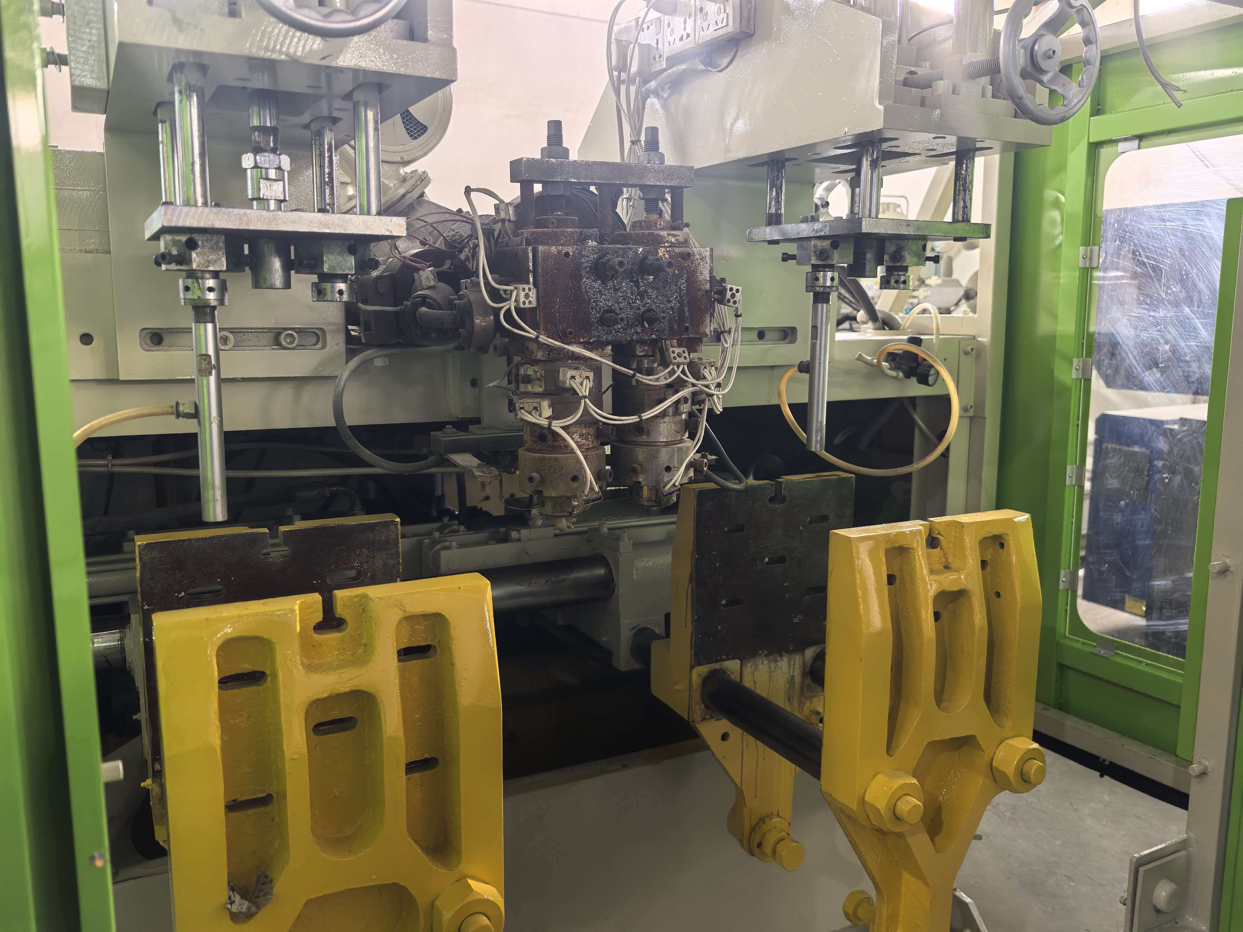 Machine is able to make 1L of 2 cavity bottle.. Machine can be changed to single head to make 3L bottles. Very good working condition.